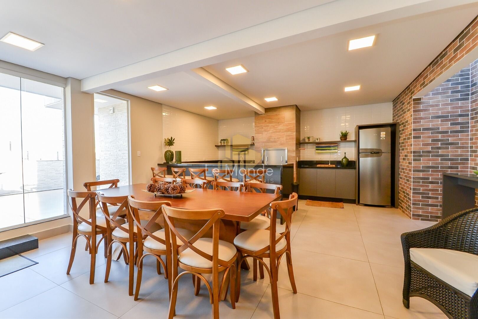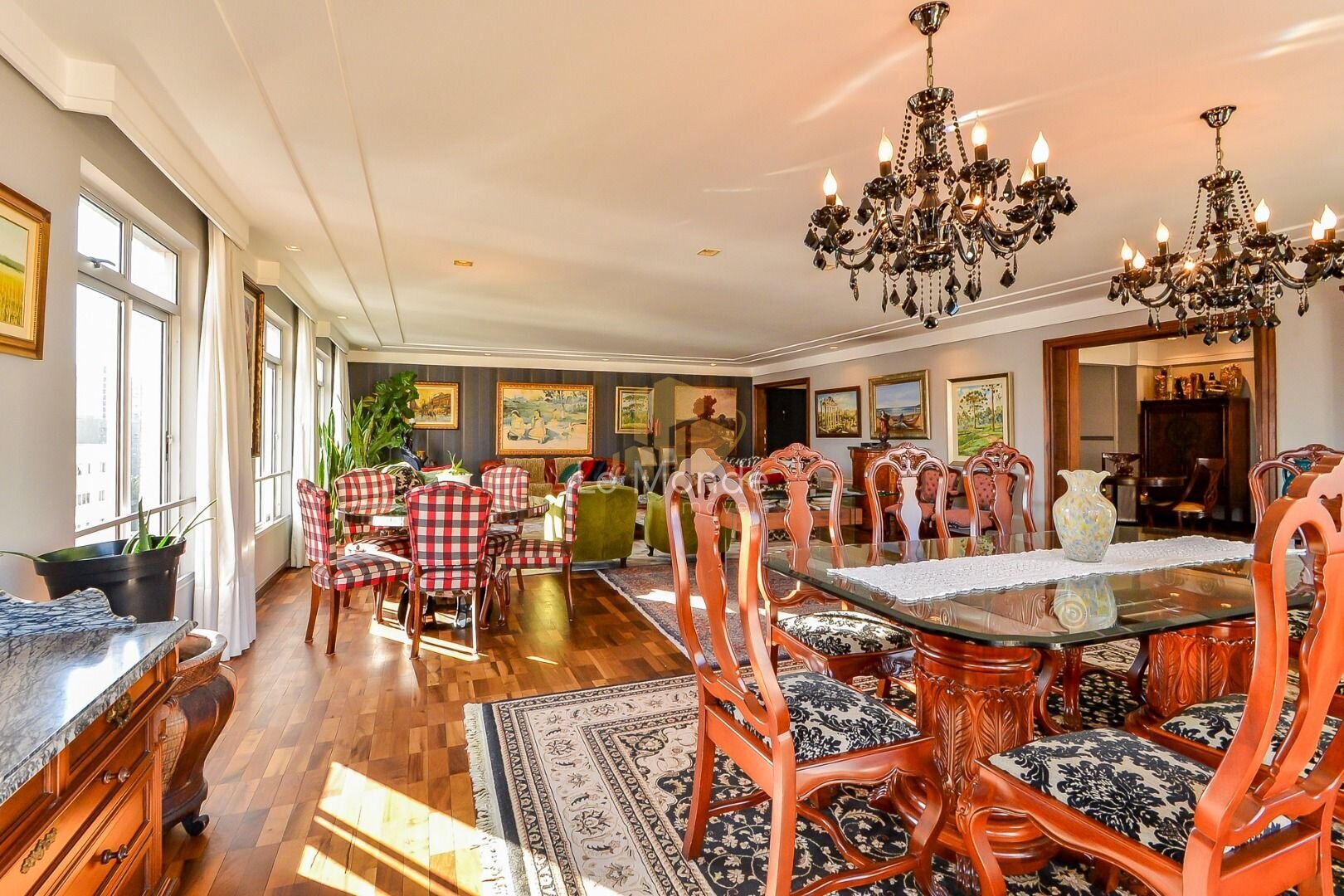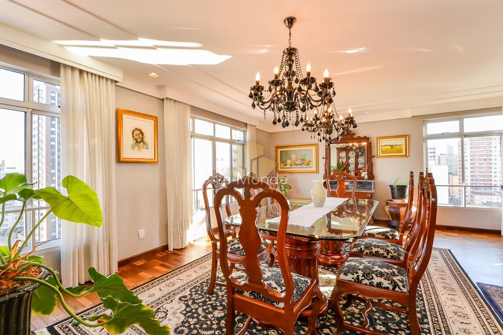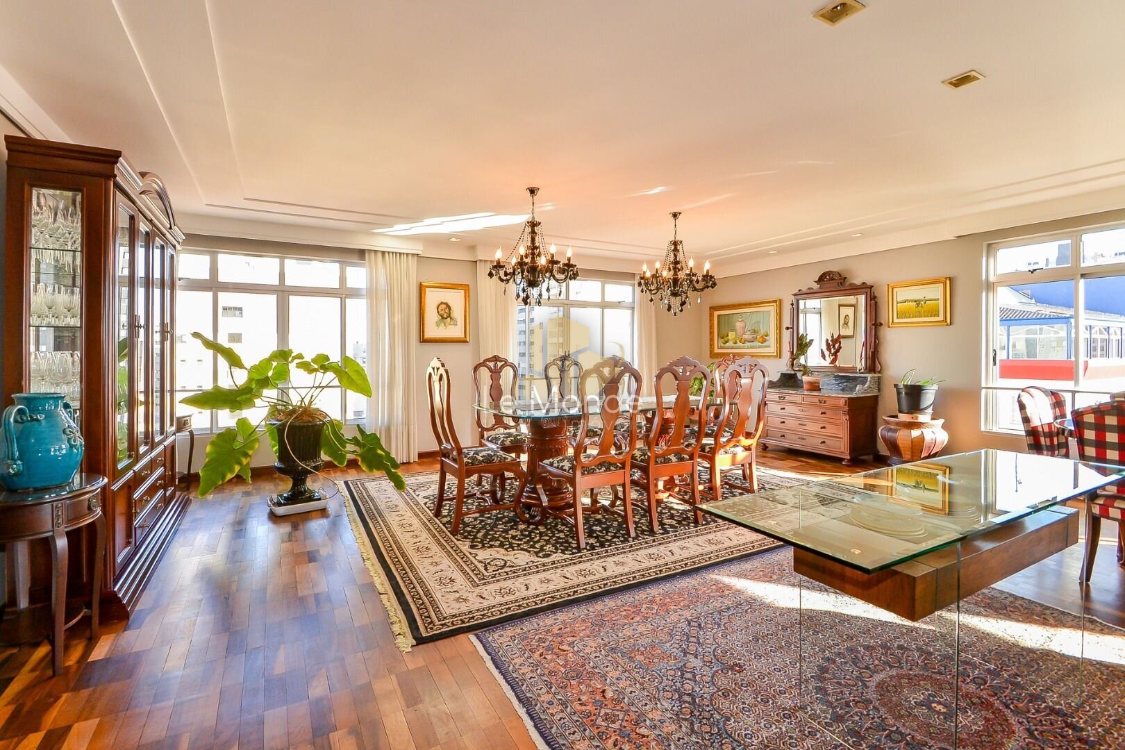 - Sala de Jantar principal, com espaço rodeado por janelas, que permitem a entrada de bastante luz natural, criando um ambiente acolhedor ;