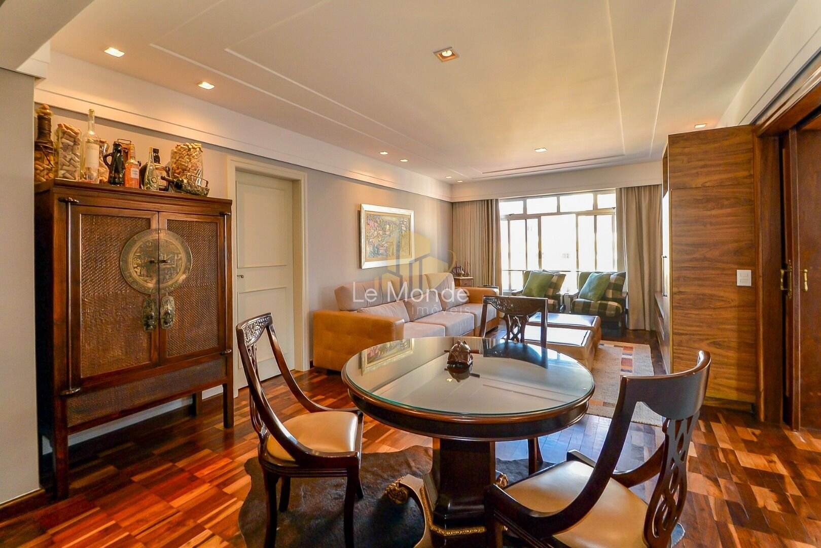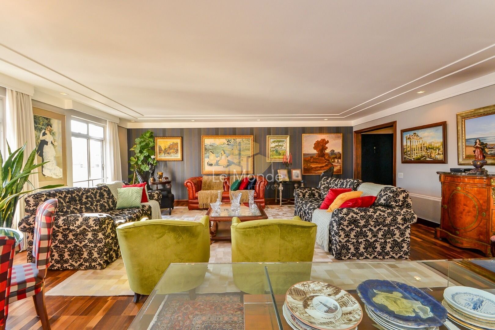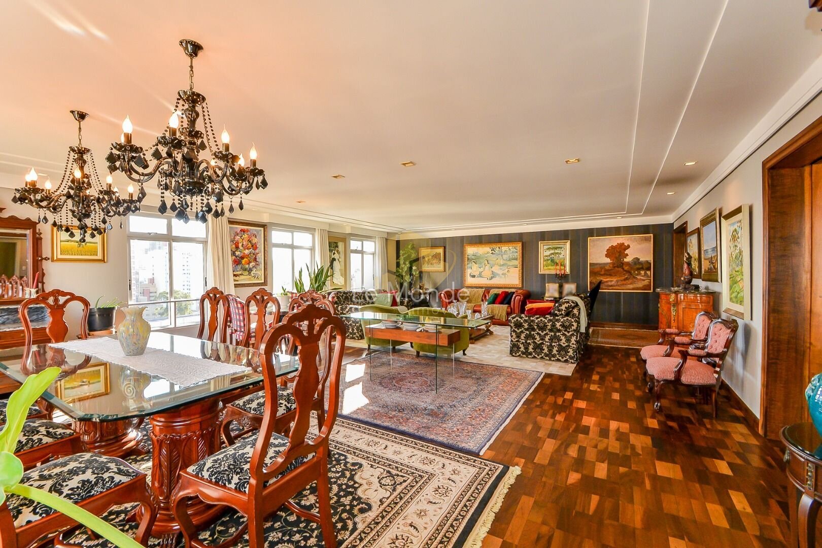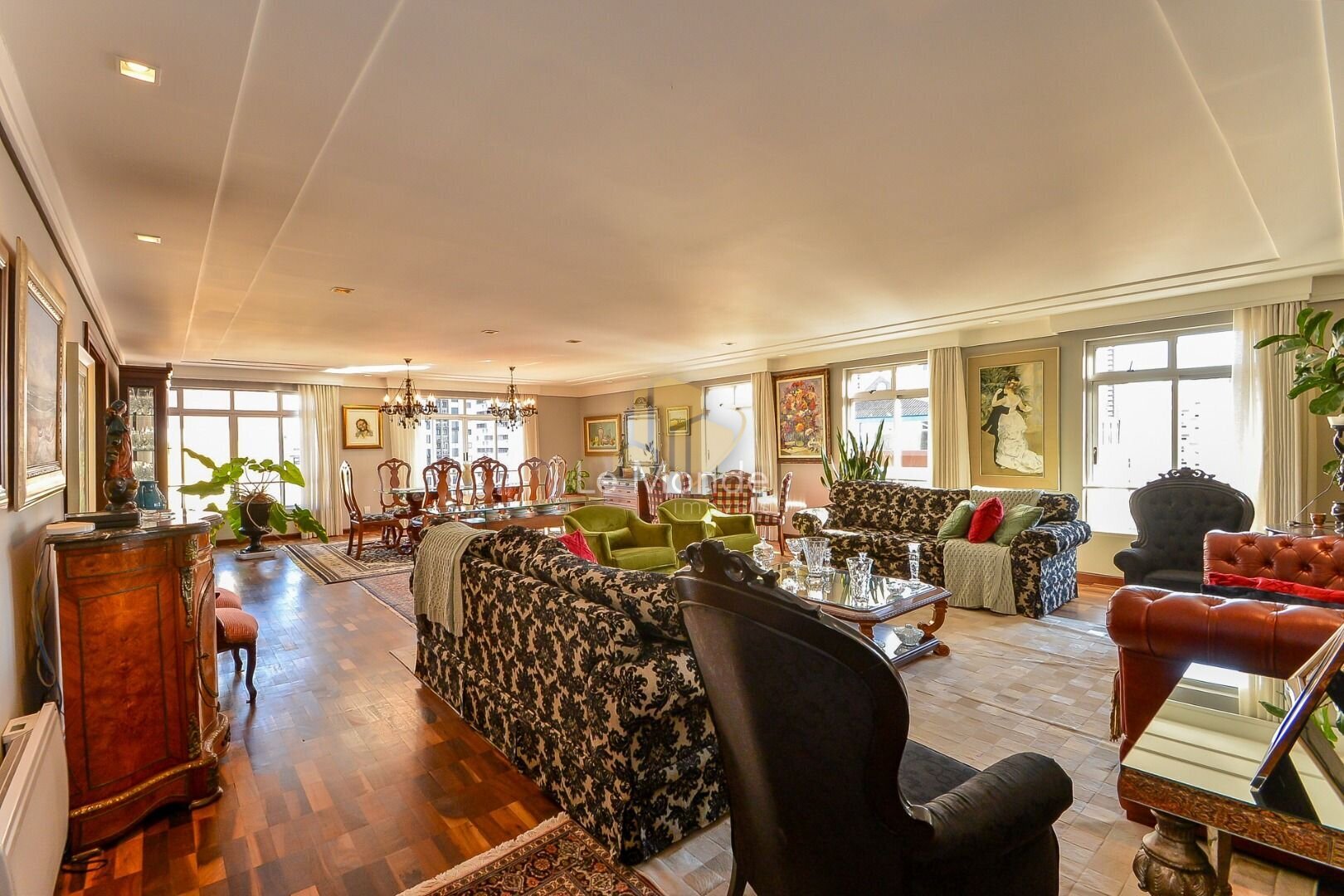 - Sala de Jantar principal, com espaço rodeado por janelas, que permitem a entrada de bastante luz natural, criando um ambiente acolhedor ;