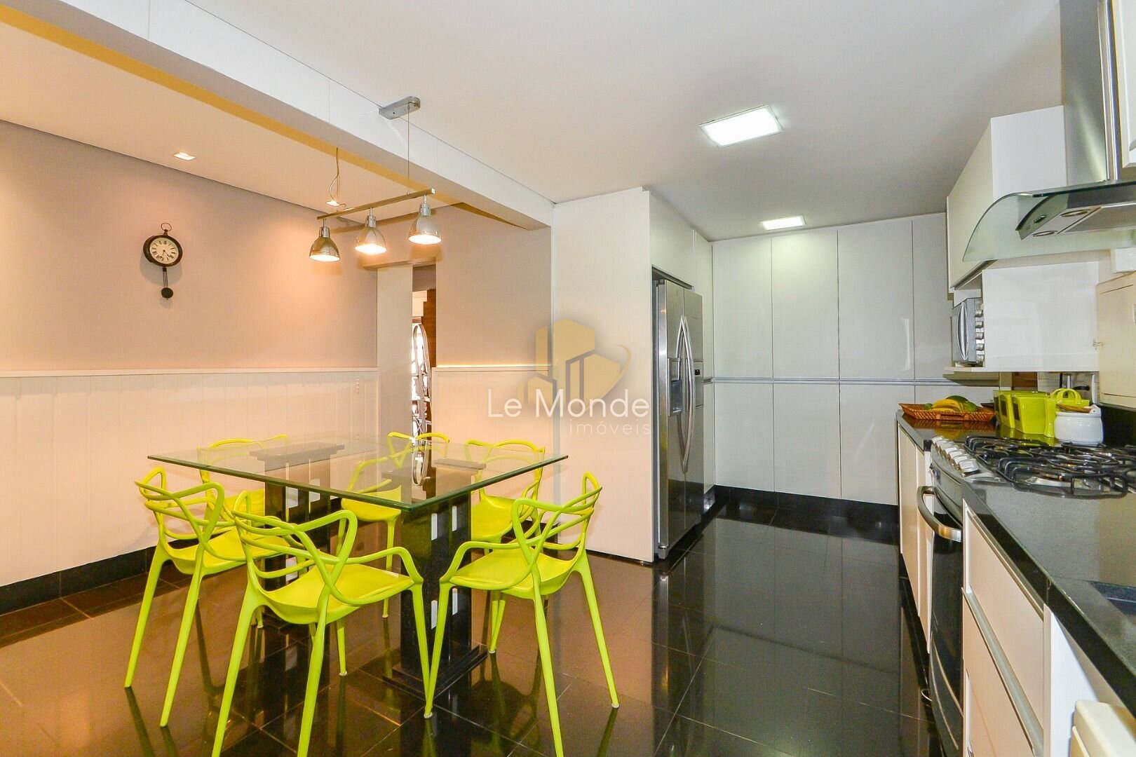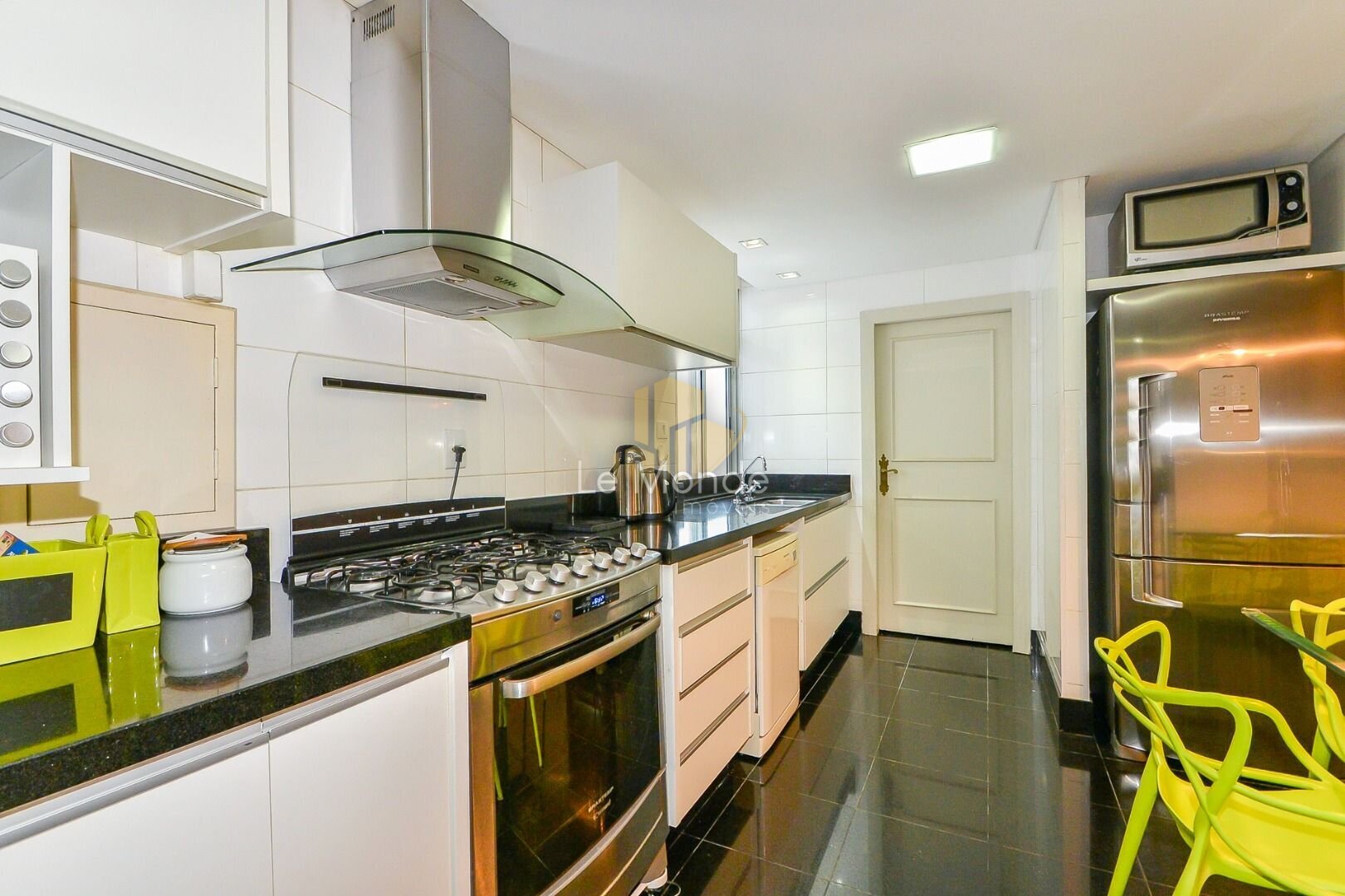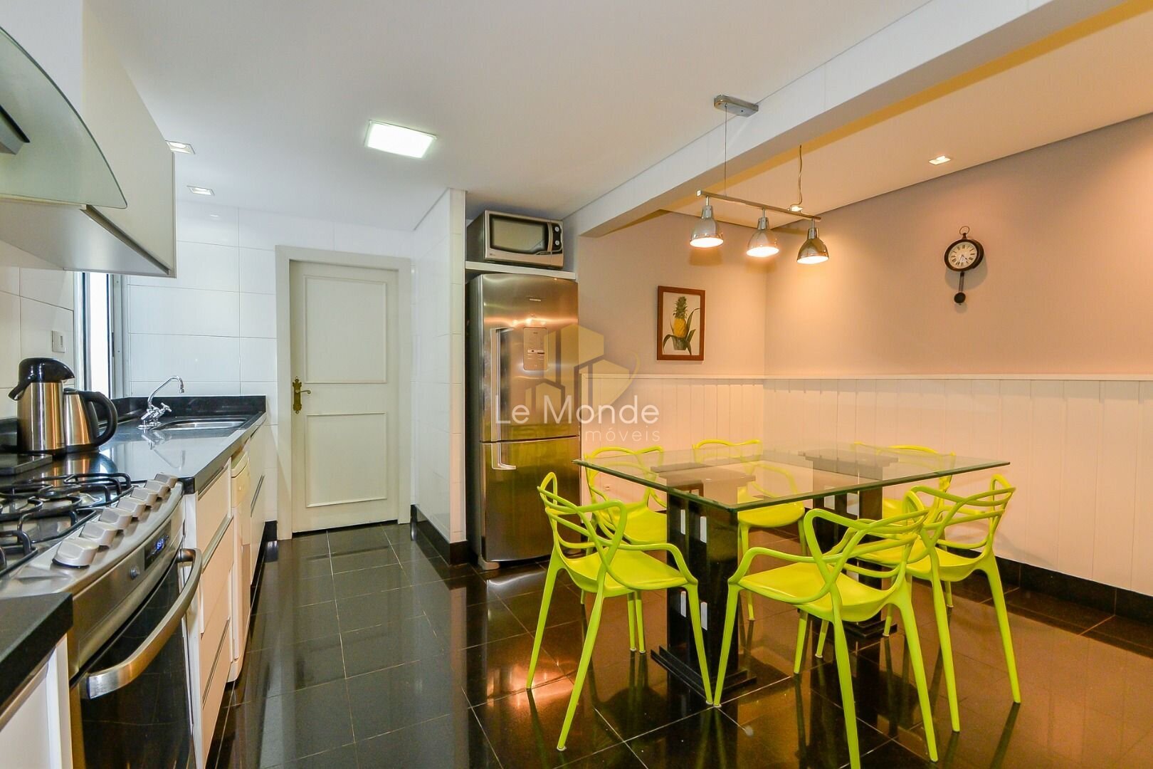 - Cozinha moderna e funcional, com copa integrada, equipada com armários planejados em branco e ampla bancada em granito preto. O espaço é prático, bem iluminado e conta ainda com área para refeições rápidas;