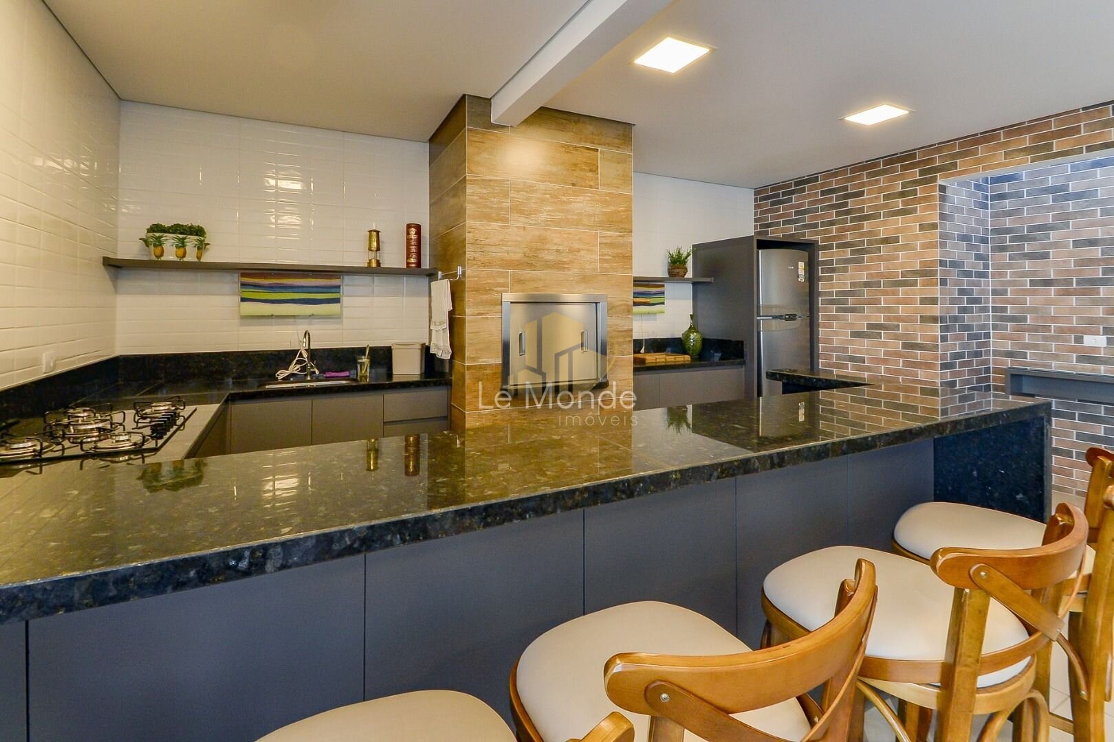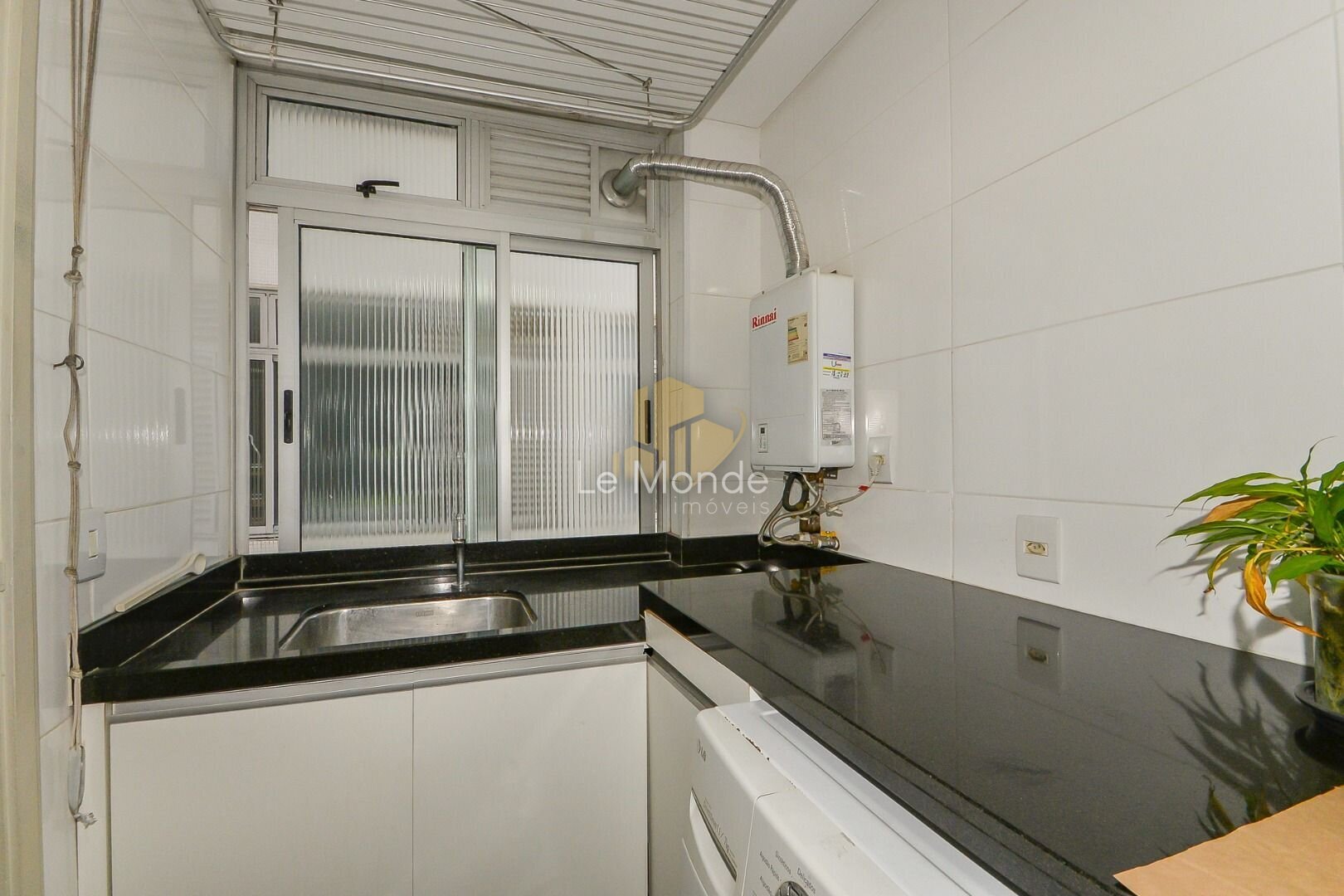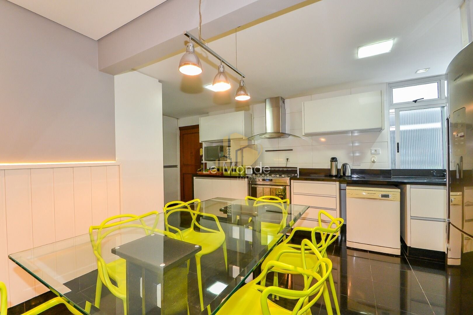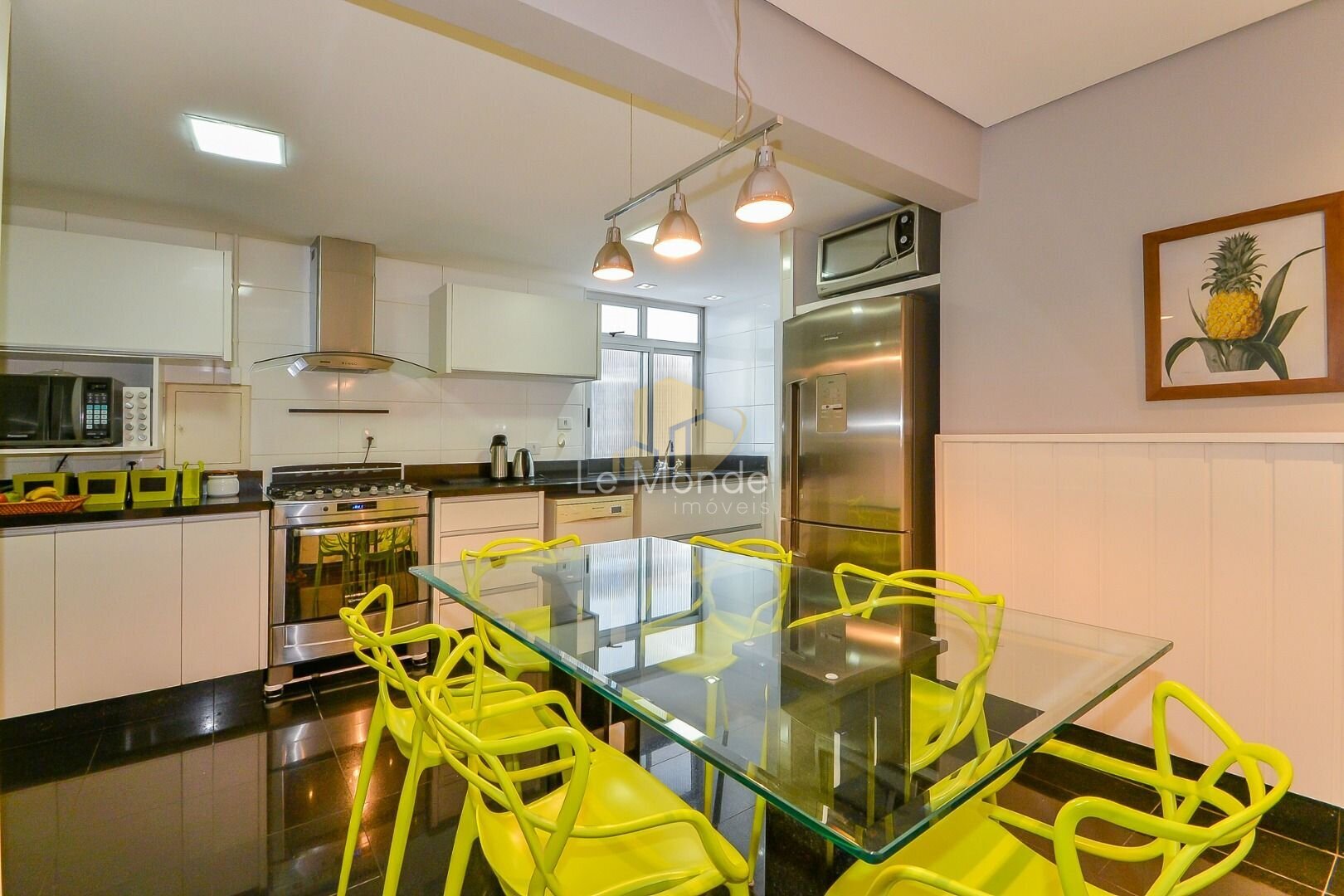- Cozinha moderna e funcional, com copa integrada, equipada com armários planejados em branco e ampla bancada em granito preto. O espaço é prático, bem iluminado e conta ainda com área para refeições rápidas;